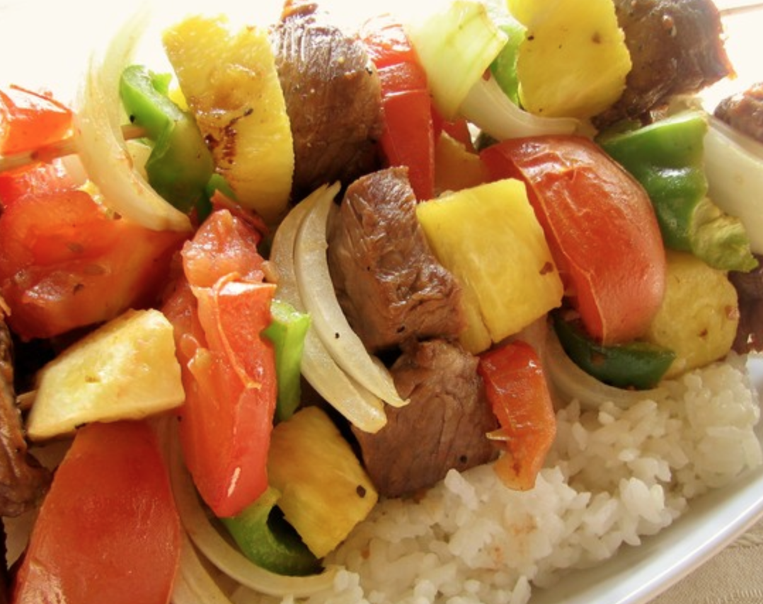 Oh boy it has been hard finding a proper recipe with ingredients that can actually be found. This week I made Beef and Pineapple Kebabs with rice.