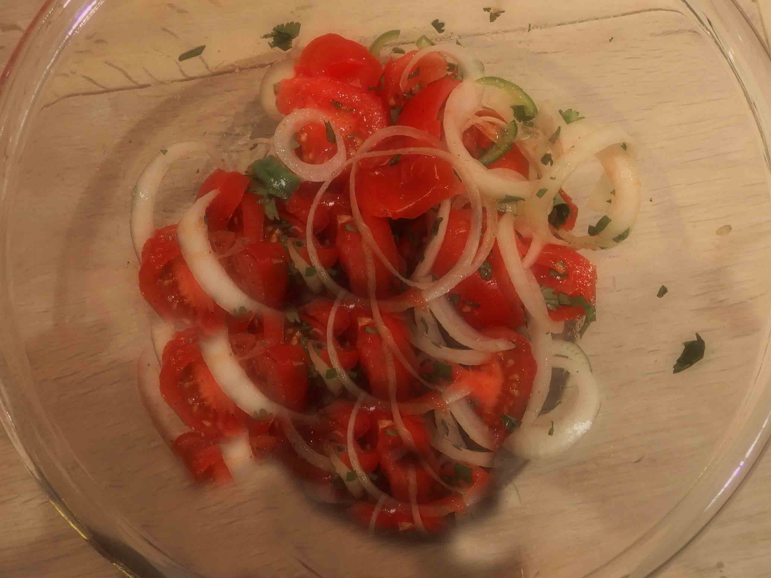 - Place the tomatoes, sliced onions, chilli and coriander into a large serving bowl.