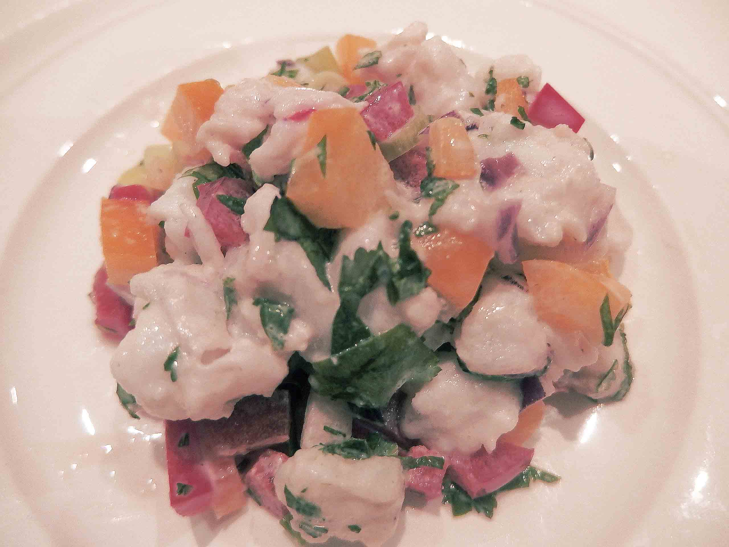Ika Mata is sort of a ceviche like salad. I absolutely loved it! I felt like I a wizard when the fish sort of cooked in the lemon juice :P. I put in the fridge raw and took it out cooked! TADAAA!! And it was yummy, tasted so summery and tropical. It would be perfect starter or side dish on hot summer day. Really something to impress people with and believe me it is so easy that you could train a monkey to make it! 😀