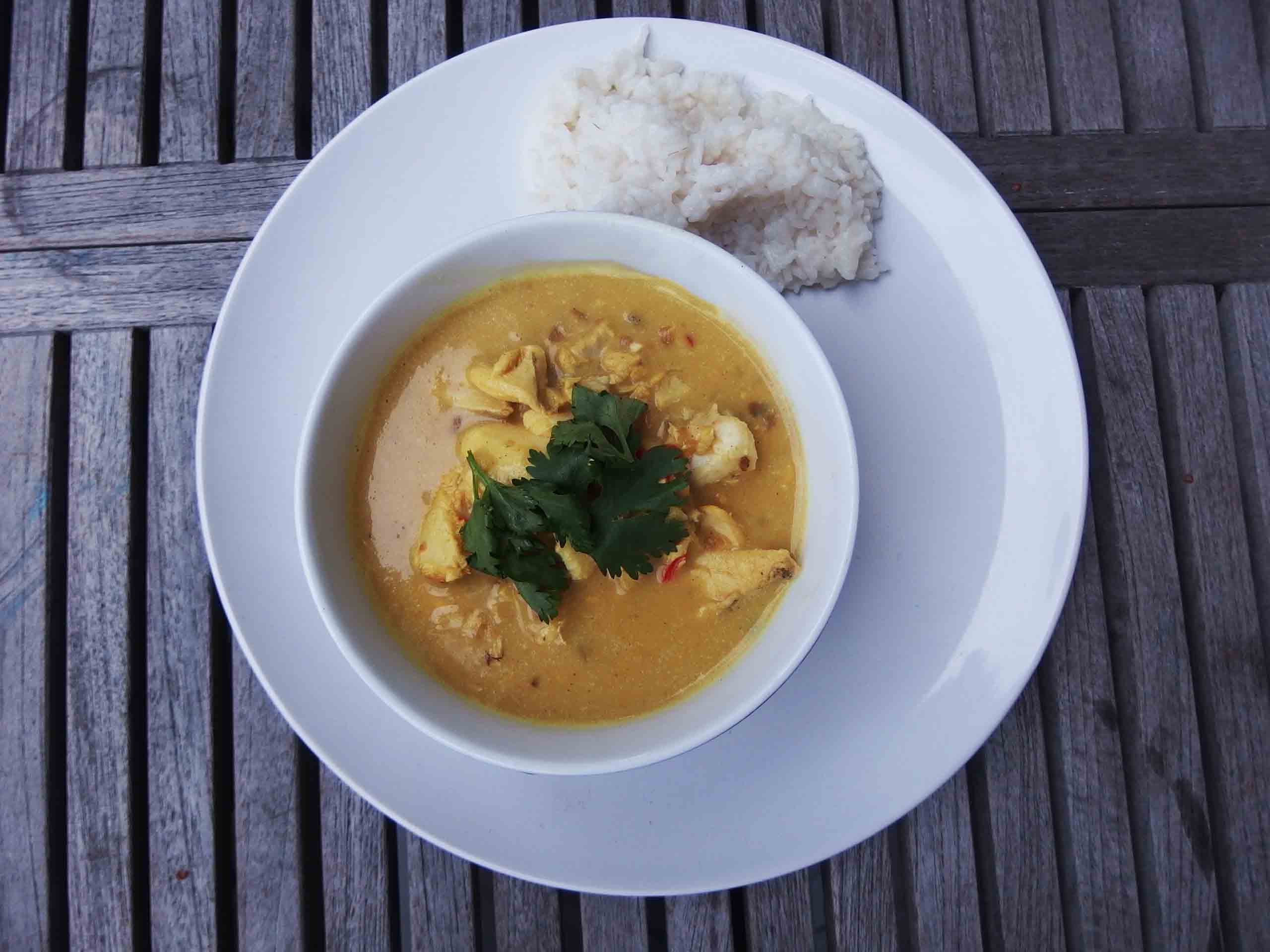 4. Pour coconut milk and cream over the fish and bring to the boil. Turn down the heat and simmer for a further 5 minutes.