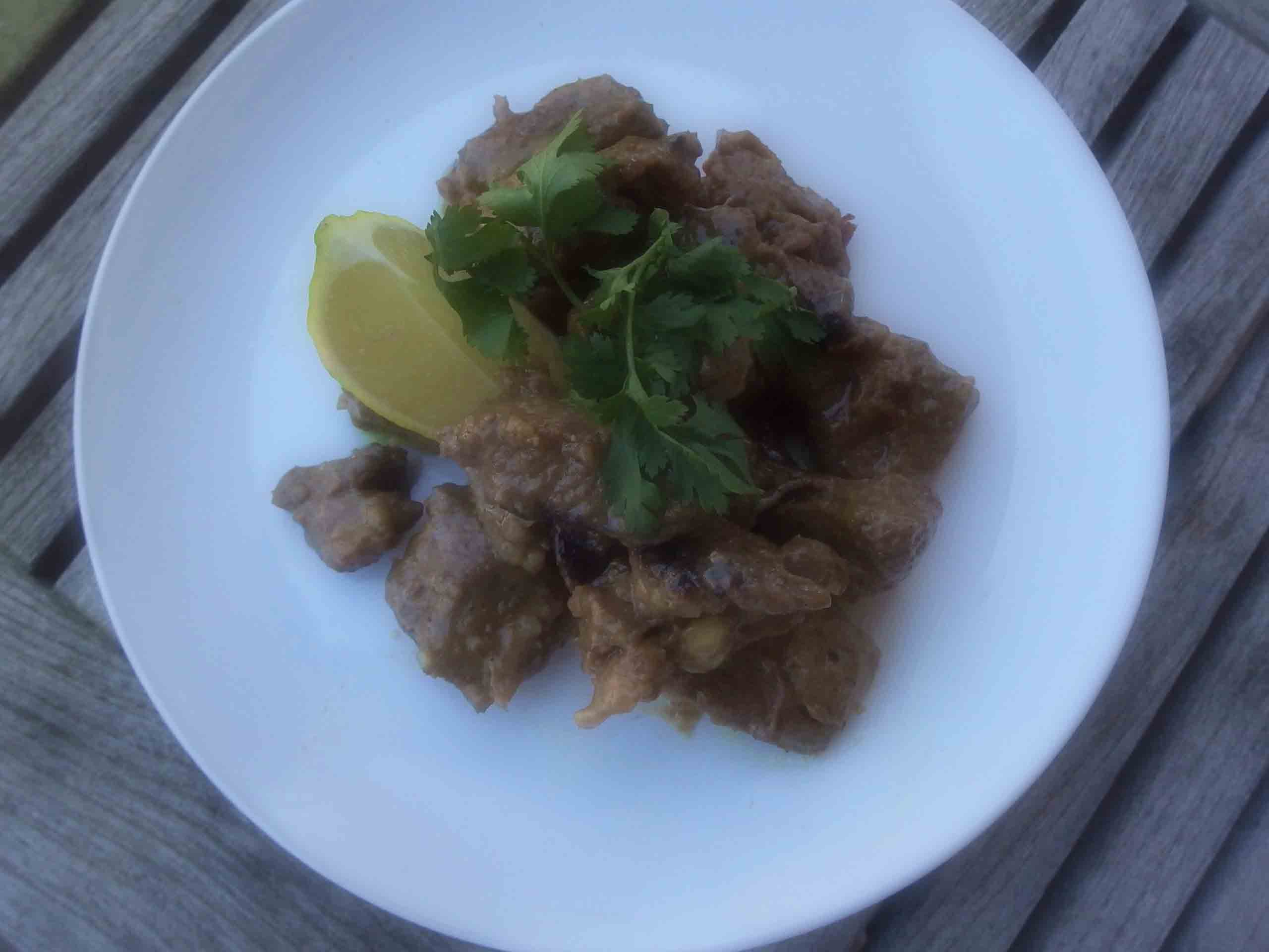 - After meat has marinated for 12-24 hours, heat coconut oil in a large skillet over medium high heat. Add the meat and vegetable mixture and brown for 5 minutes. Add garlic and cook for 1 minute more, then pour in stock and coconut milk. Bring to a boil, reduce to simmer, cover, and cook until very tender and thickened, about 2-3 hours. Adjust seasoning by adding more salt or curry powder as desired.