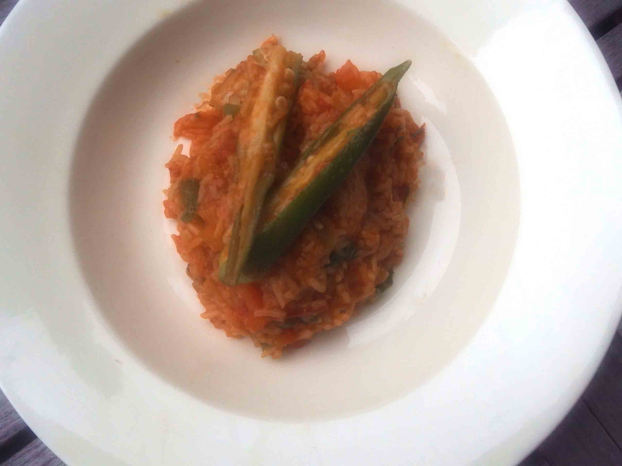- Take the lid off (the rice won’t be cooked yet) then scatter the peppers and okra over the rice. Re-cover and cook for 10 mins until the veg is softened and the rice tender. Just before serving, mix the veg through and scatter over coriander.