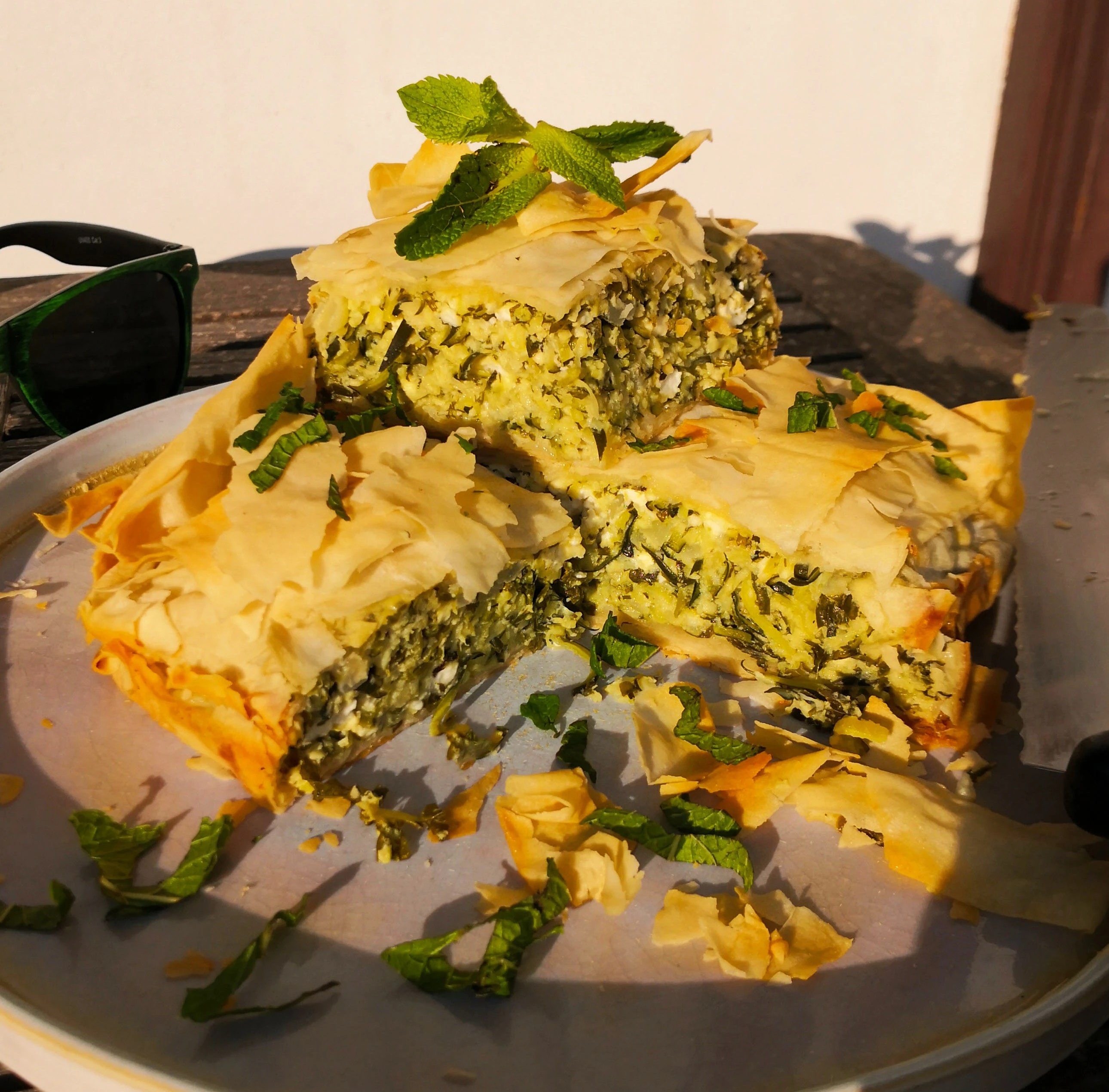 - Cover with a sheet of phyllo dough and brush with olive oil; continue until you have 6 layers of phyllo dough;