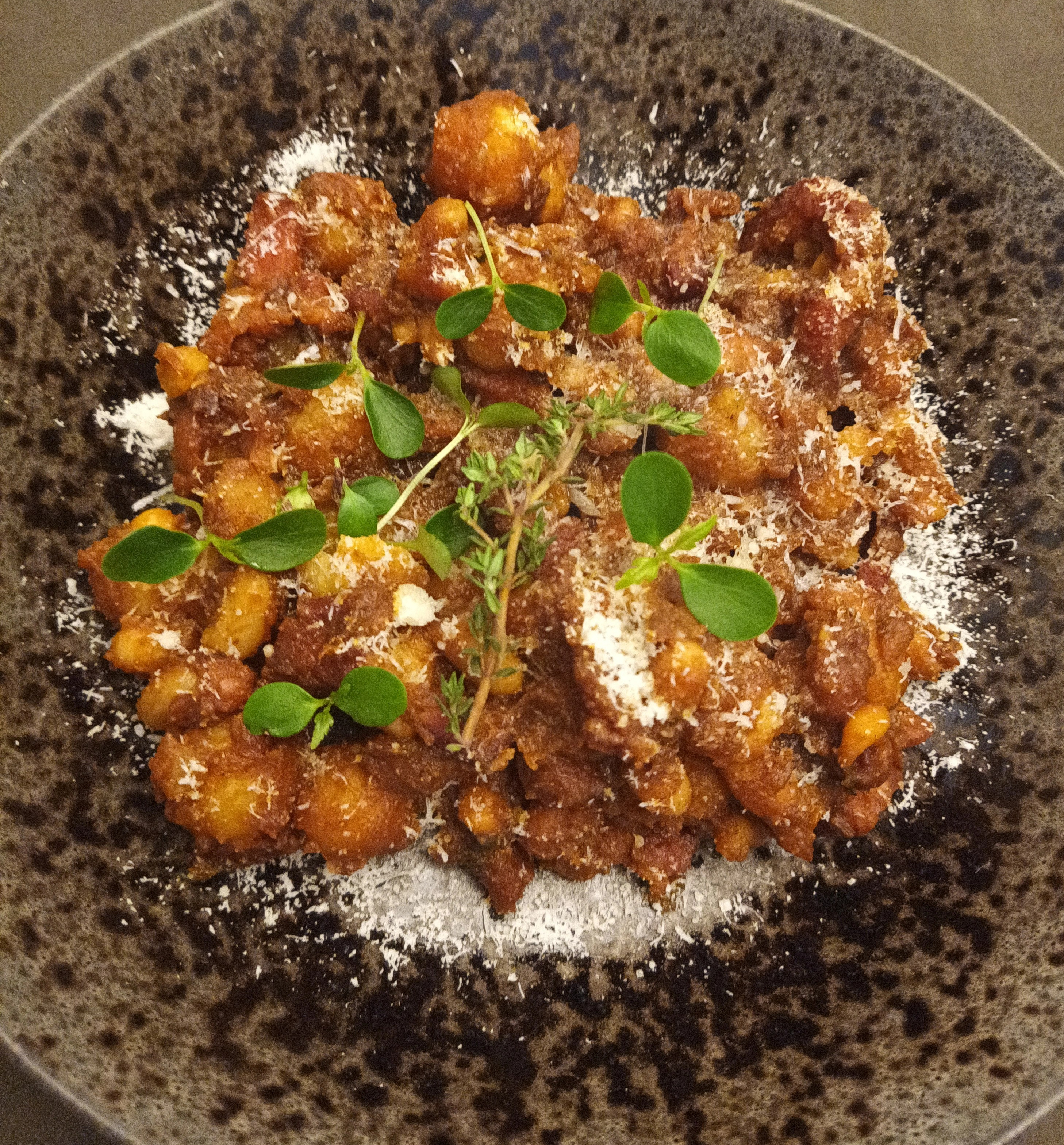 3. Finely grate the cumin cheese, add the kidney beans (including liquid) white beans (including liquid), the baby potatoes, cheese, thyme and applesyrup to the pan.