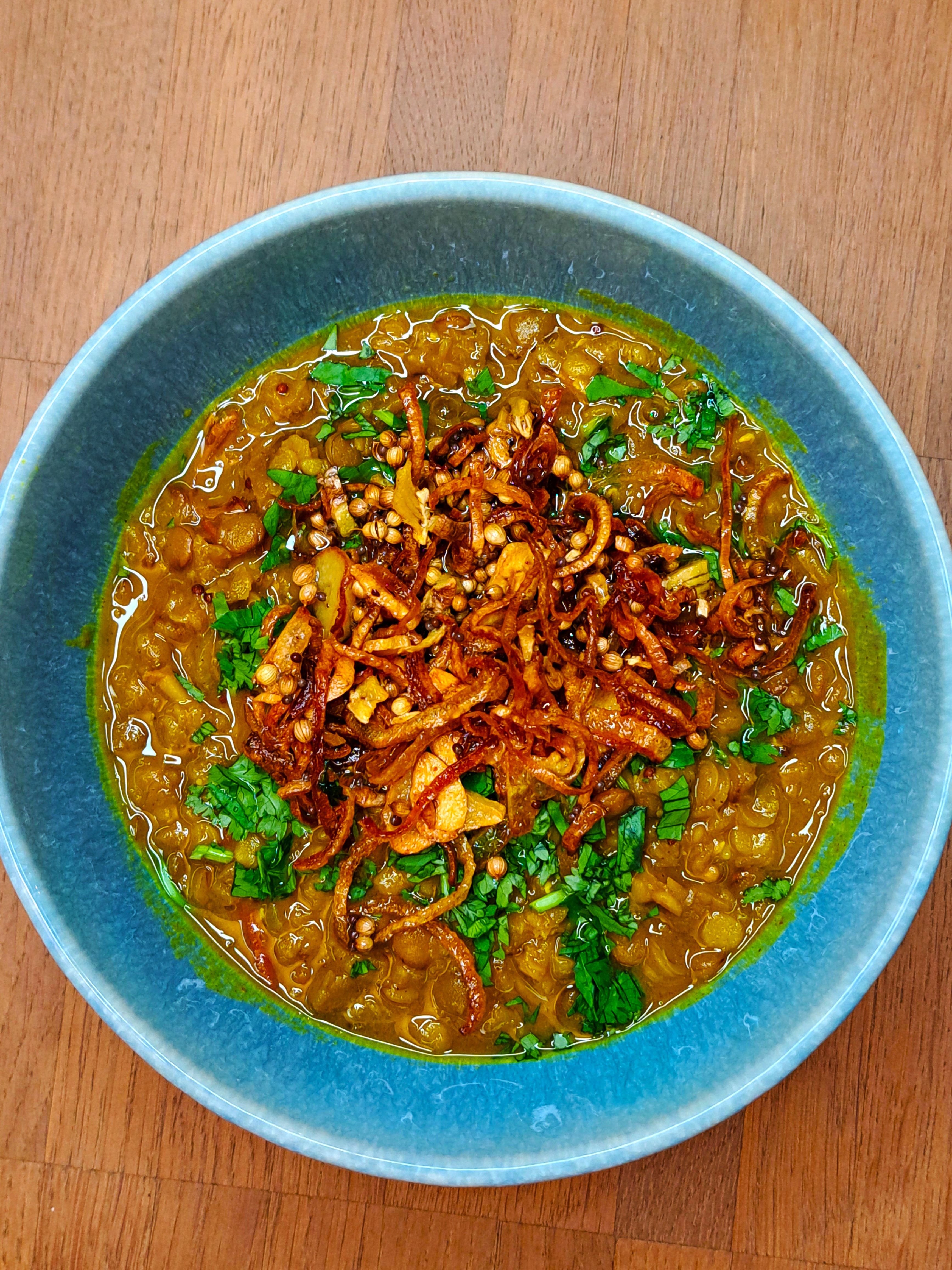 I really liked this lentil curry! Especially the crunch on top! The tempering process involves heating another small amount of oil or ghee in a separate pan. Cumin seeds and other tempering ingredients, such as mustard seeds and dried red chilies, are added and allowed to sizzle and release their flavors. This tempered mixture is then poured over the cooked lentils. This recipe is for 5 people